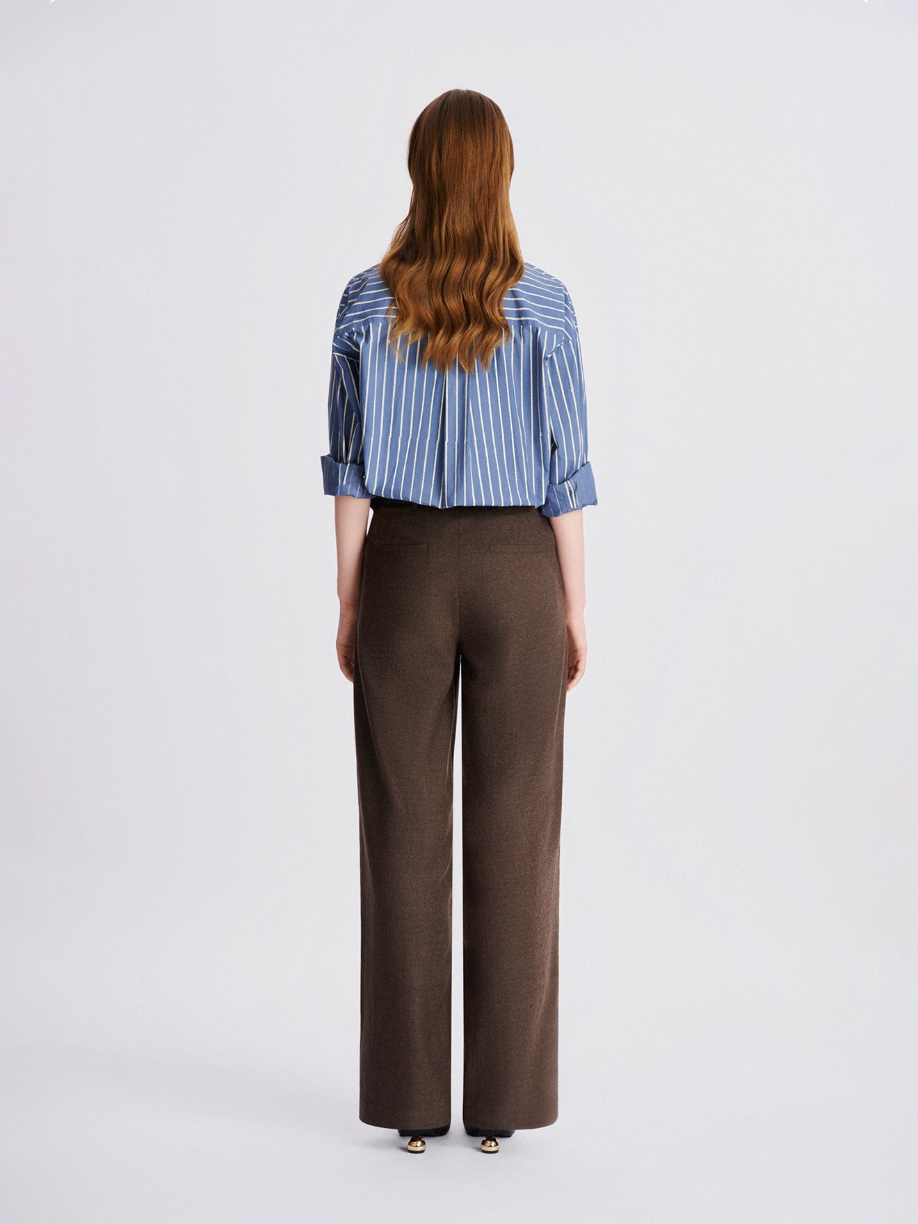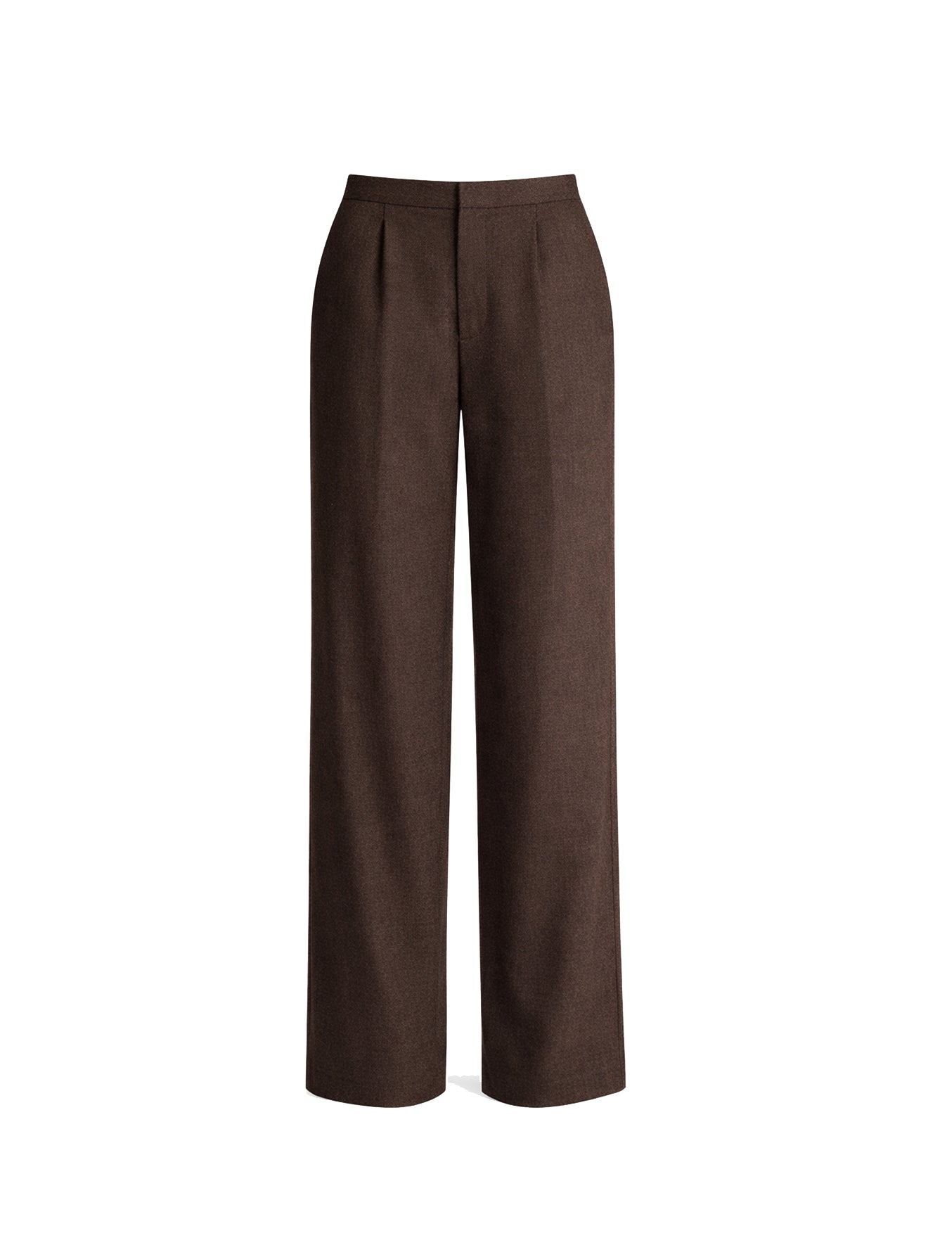 Cut with a clean wide-leg silhouette, these tailored trousers come in a deep espresso shade for a refined, elongated look. They offer natural structure, breathability, and a fluid drape that holds its shape throughout the day. Easy to style and designed to move effortlessly from day to evening.