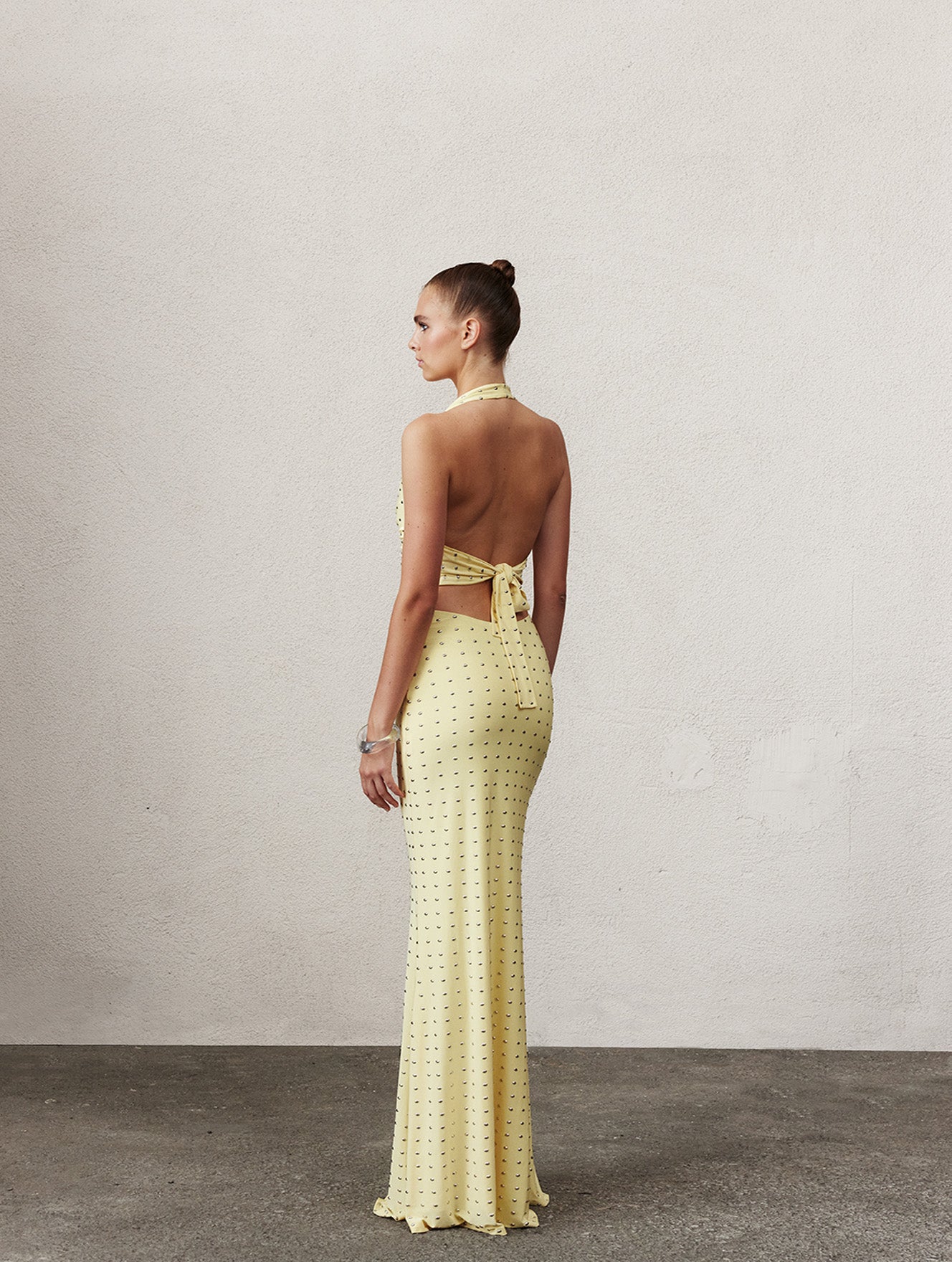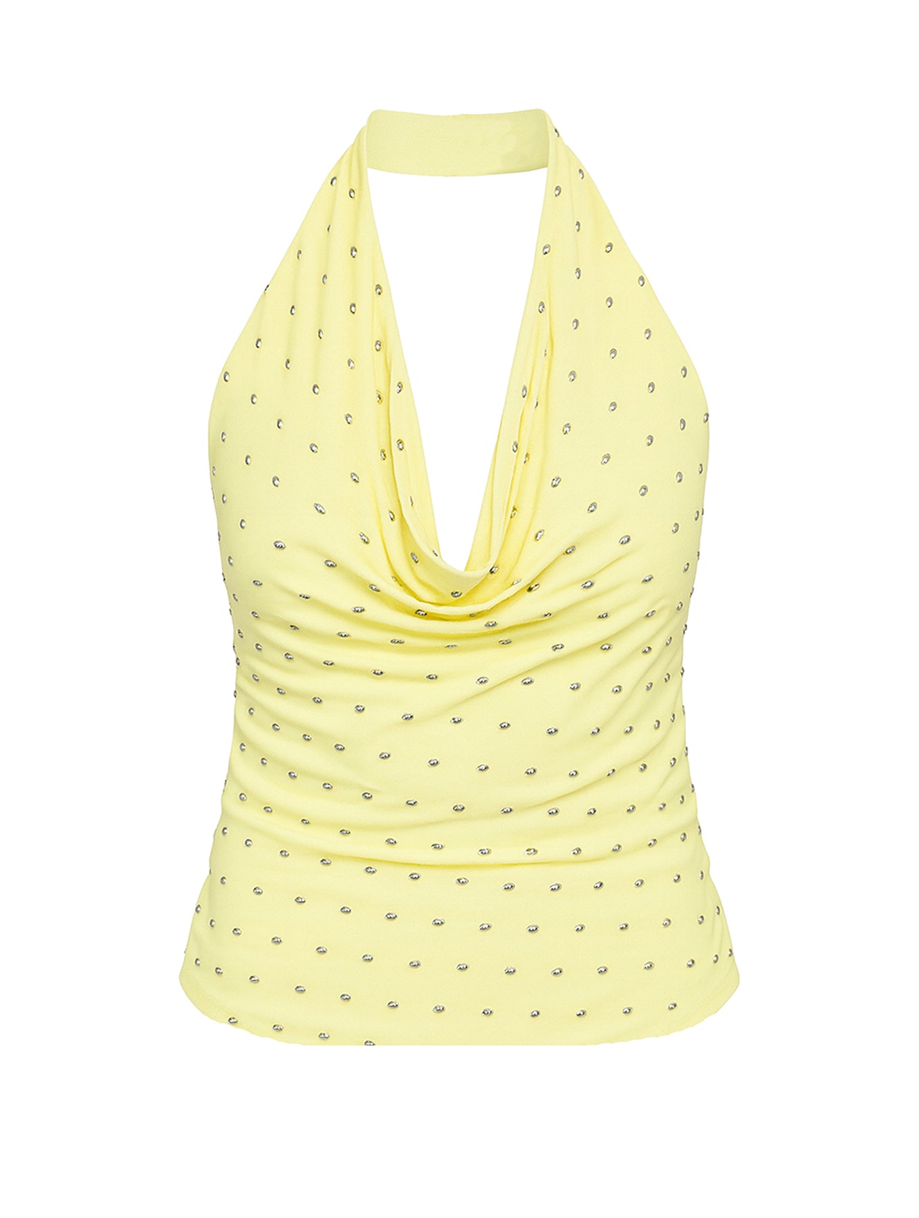 A draped halter-neck blouse crafted from stretch jersey in a vibrant lemonade yellow tone. designed with a soft cowl neckline that falls fluidly across the front, creating an elegant and feminine silhouette. the open back ties delicately at the neck, while subtle rhinestone embellishments add a refined sparkle. a versatile piece that moves effortlessly from day to evening.