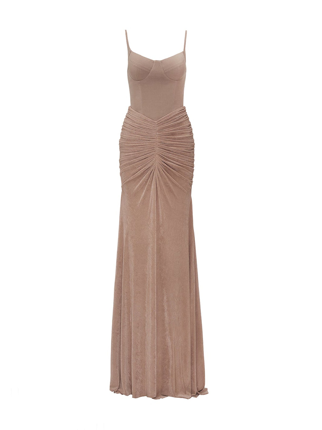 The bodysuit features faux corset boning with a structured bust. The skirt is pleated at the hips, with a hidden slit within the wide skirt layers, and the pleats accentuate and enhance the body's curves.