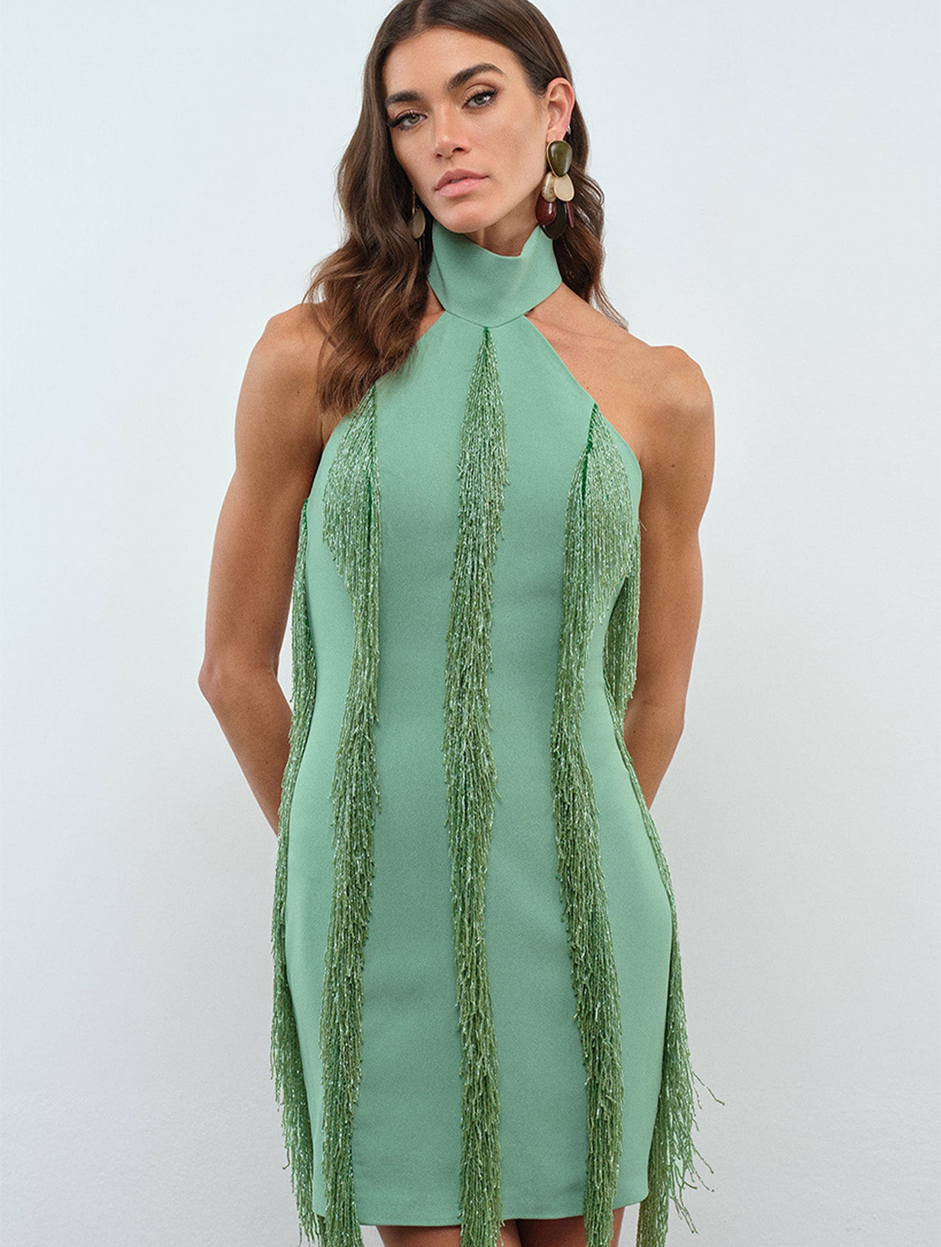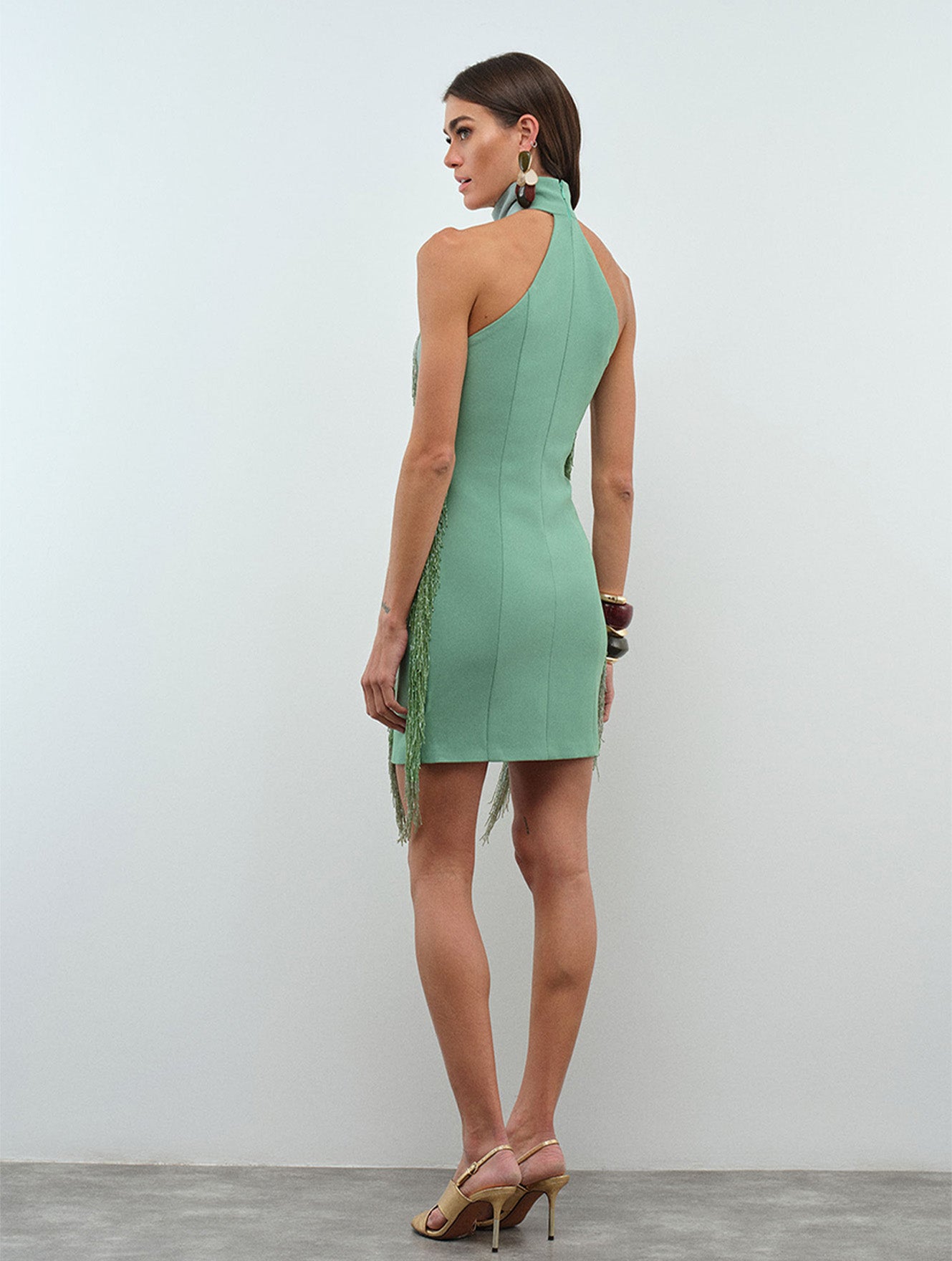 Eleni Dress – Mint Crepe Fringe Halter Mini Dress