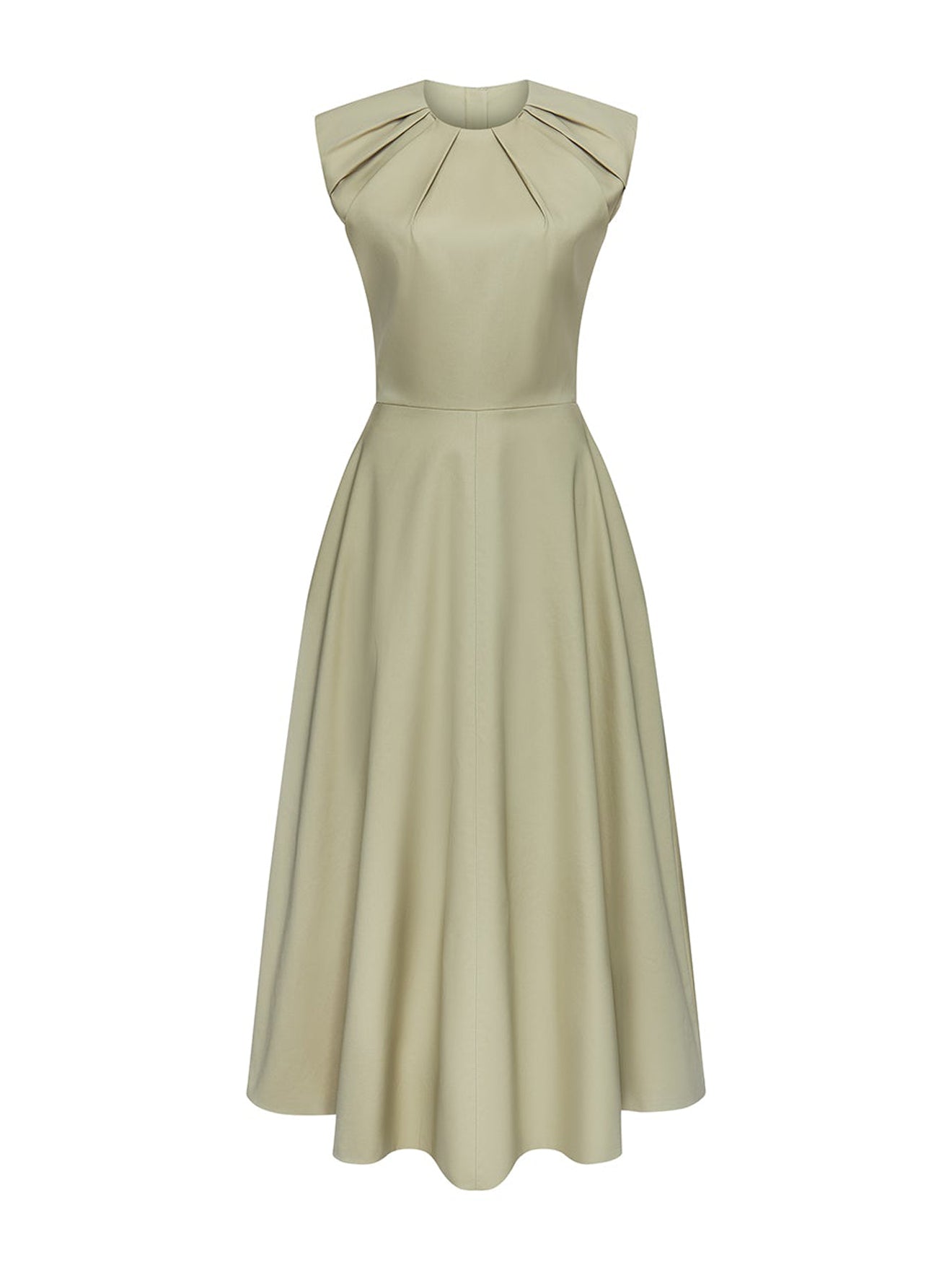 The Tonny pastel green pleated skirt showcases a pleated neck detail and a flared silhouette. This sleeveless, mid-length skirt also boasts a straight hem for a sleek look.