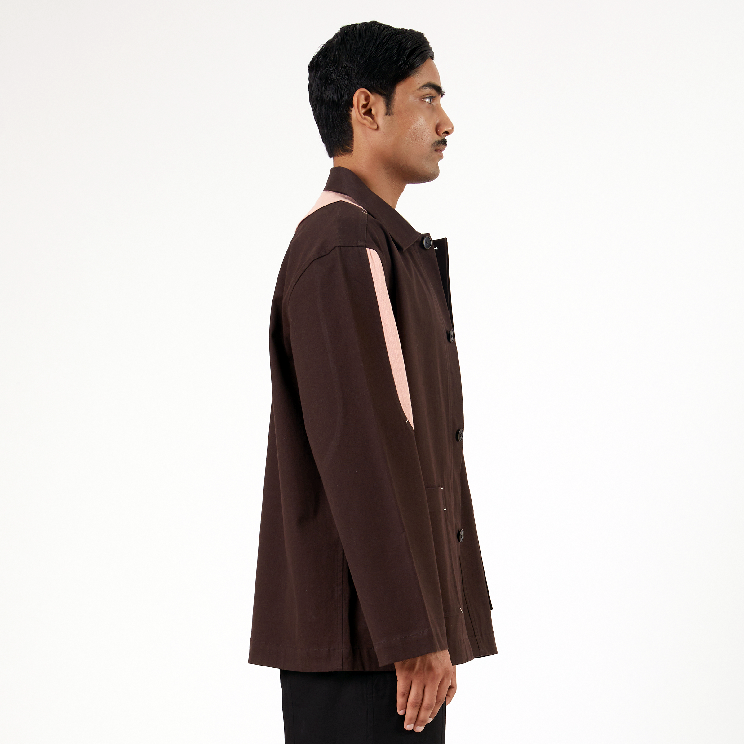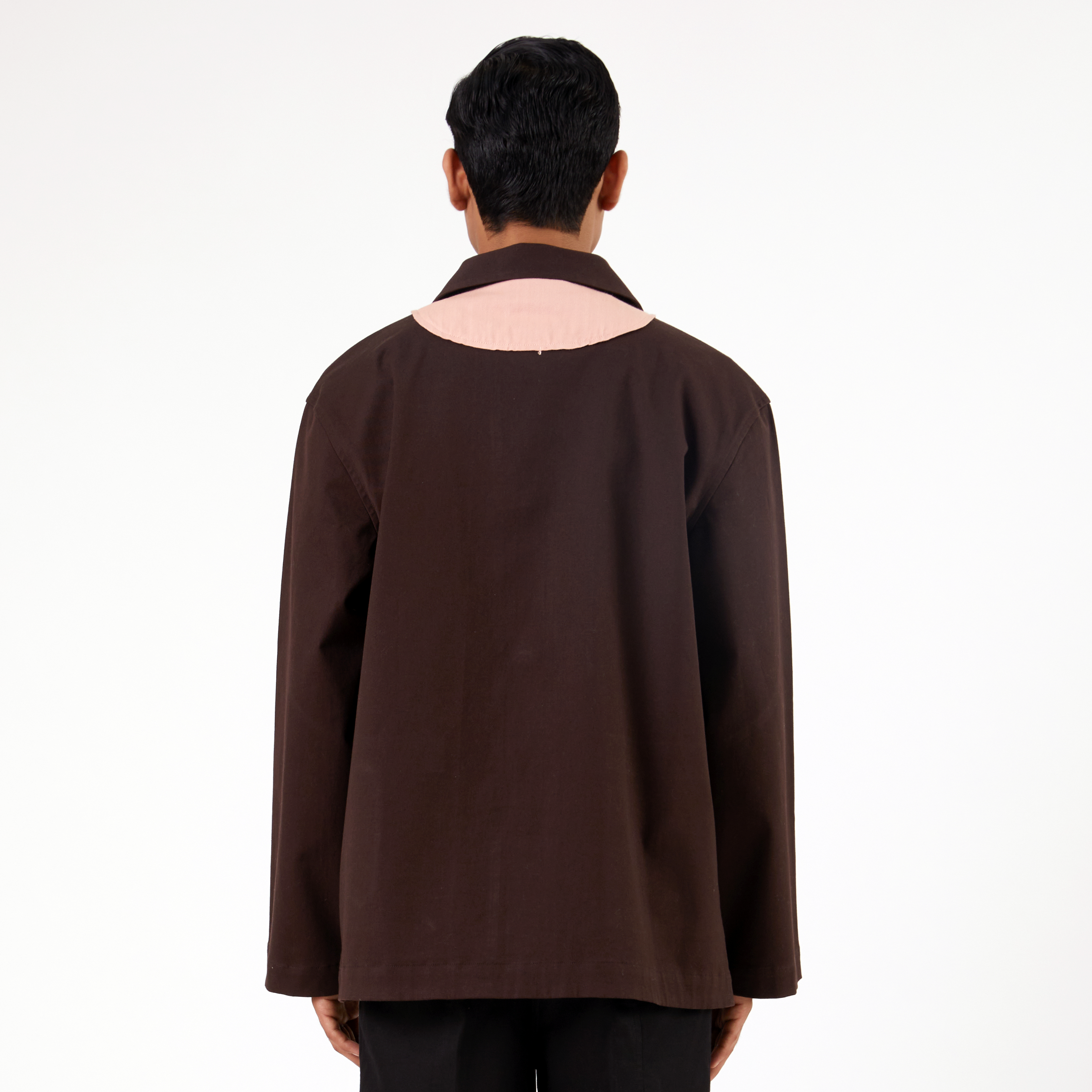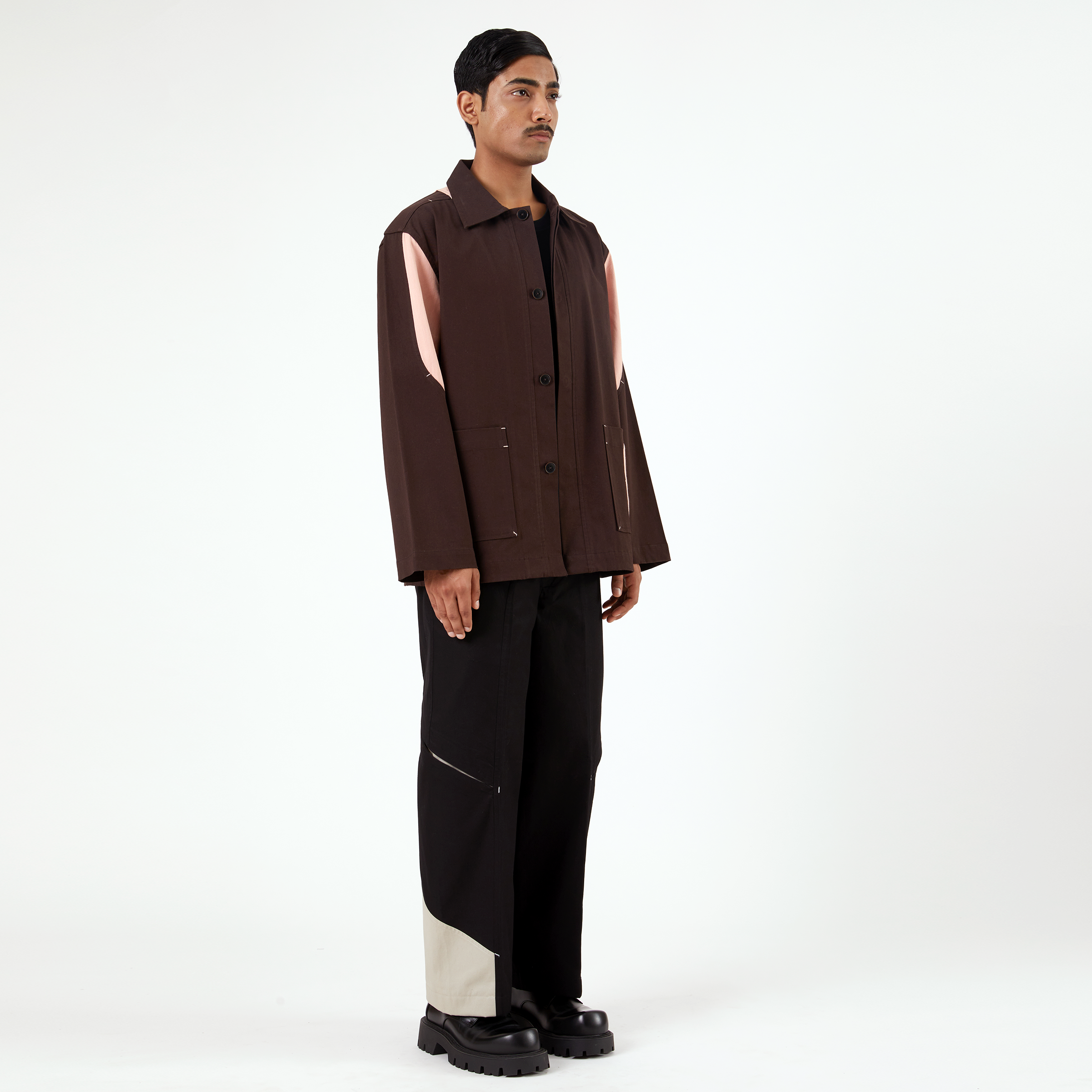 Our signature Binary Fission Overshirt, crafted in 100% cotton twill, features a relaxed straight fit with bold color blocking and symbolic sleeve cuts. Front patch pockets come detailed with contrast bar tacks and a Human Symbol patch. Hand-tack accents appear throughout—quiet signs of craft on a best-selling silhouette.