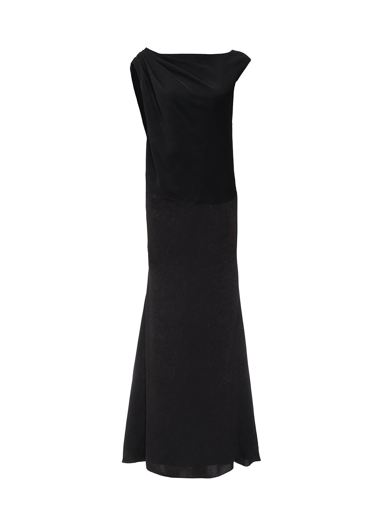 With pleats and wave-like seams, the Bobing Noir single-shoulder shift dress boasts a crepe bodice and raw silk skirt for a unique and elegant look.