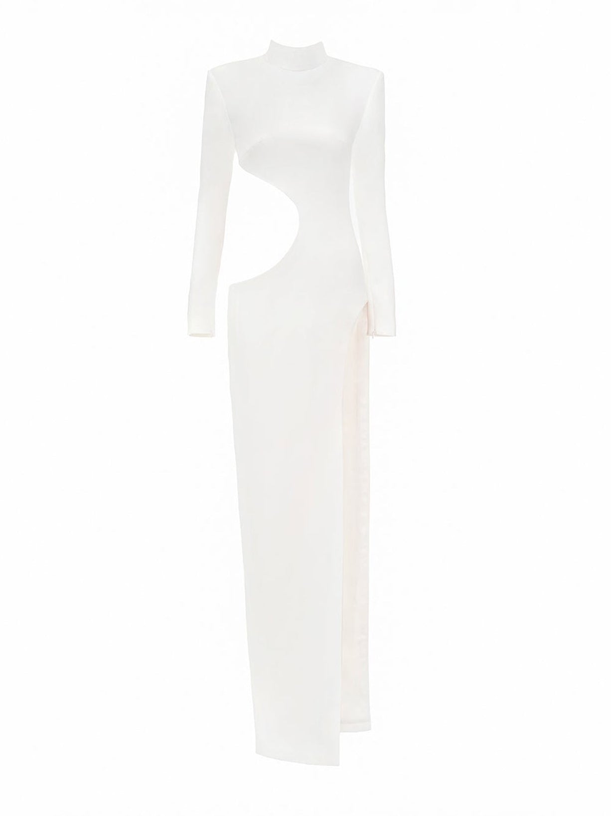 Utilizing the serpentine movements of water, we employ precise cuts and a tall collar design to achieve the ideal proportions on the figure, uncovering only the necessary parts. Made with crepe fabric and lined with silk, our Winding Long Dress measures 165cm in length and is modeled in size S.